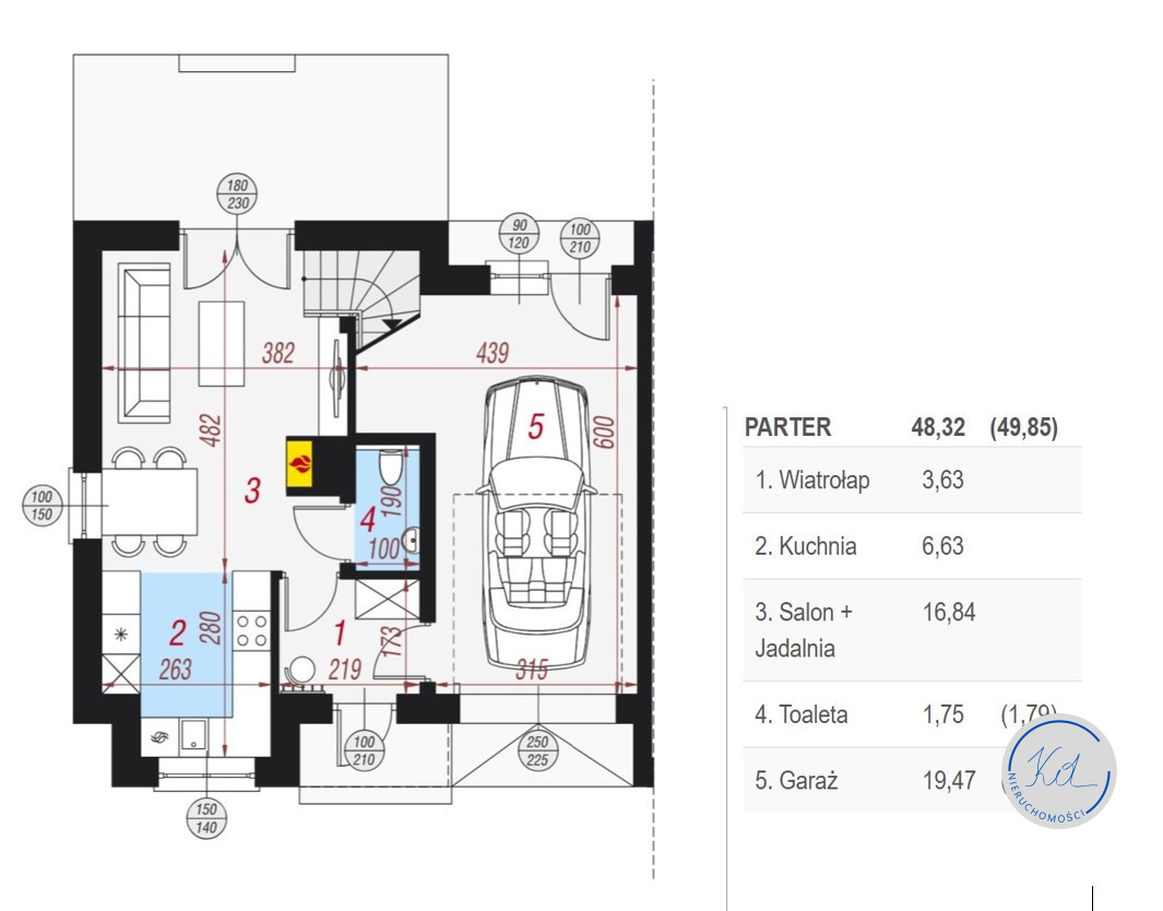 Dom będzie miał 103,26m2 powierzchni całkowitej (użytkowej 96,75m2), rozmieszczonej na dwóch kondygnacjach, funkcjonalnie rozdzielających strefę dzienną od sypialnianej, z garażem w bryle oraz dodatkowym miejscem parkingowym na podjeździe.